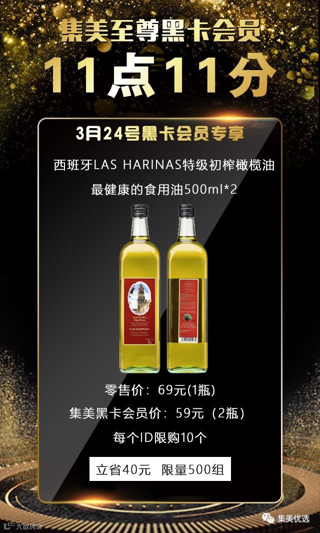3月25日,11:11,在集美会员专享,只需要59元就可以买到正品西班牙LAS HARINAS特级初榨橄榄油最健康的食用油500ml*2瓶,立省39元,限量500组,手慢无!!!