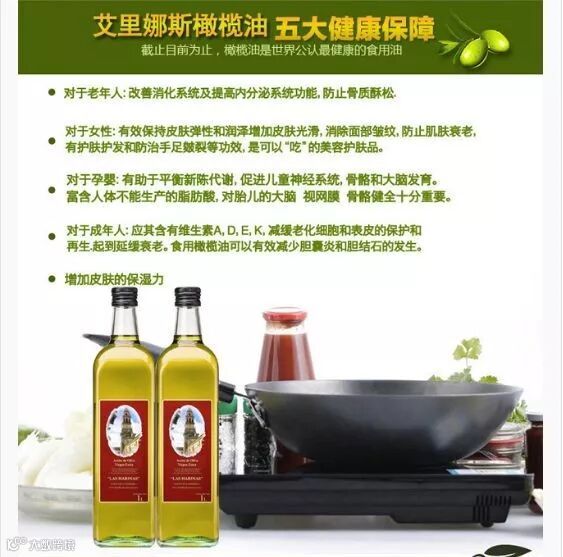 橄榄油是由新鲜的油橄榄果实直接冷榨而成的,不经加热和化学处理,保留了天然营养成分。橄榄油中包含不饱和脂肪酸,富含谷固醇和多种维生素以及各种微量元素。 能促进血液循环,防止动脉硬化及其并发症、高血压、心脏病、心力衰竭、肾衰竭、脑出血。