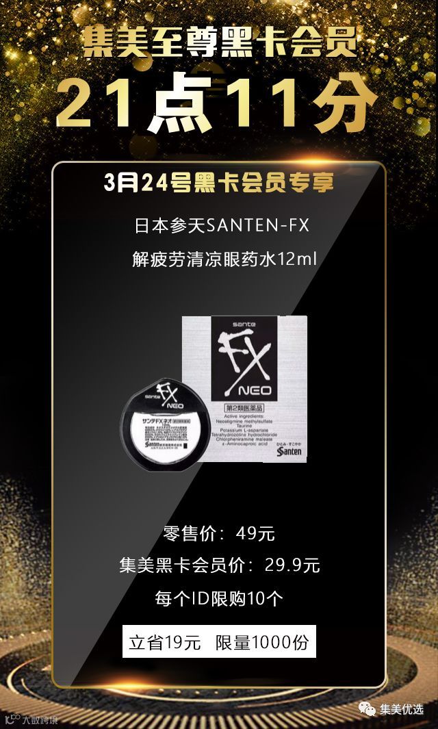 3月25日,21:11,在集美会员专享,只需要29.9元就可以买到正品日本参天SANTEN-FX 解疲劳清凉眼药水12ml一瓶,立省39.2元,限量1000份,手慢无!!!