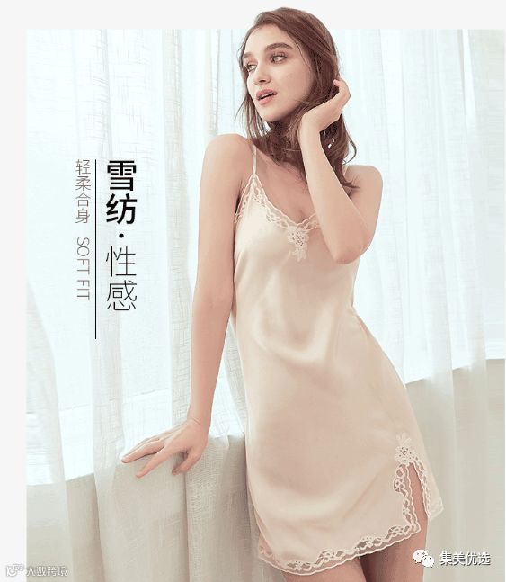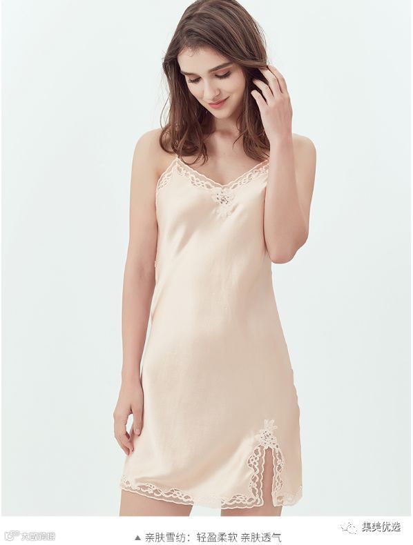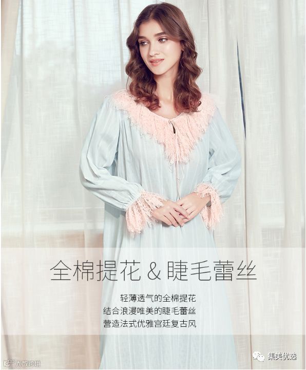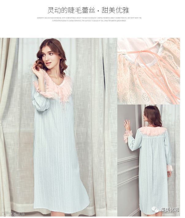有一种内衣叫:老公 z喜欢~这条裙子,不但老公喜欢,自己也爱的疯狂啊。全棉提花和睫毛蕾丝面料,搭配荷叶边长袖圆领设计,轻薄透气,结合浪漫唯美的睫毛蕾丝,甜美优雅,这个款式总是特别耐看,经得住洗礼的经典款,超级有女人味。气质中透着内敛成熟,性感又有韵味。前面看是一条气质透着奢华的睡裙,优雅又简洁知性。袖口和领口赚足了眼球,A字裙摆设计,大幅度提升舒适度,自由不束缚,自然显瘦,修饰出性感的腰身。