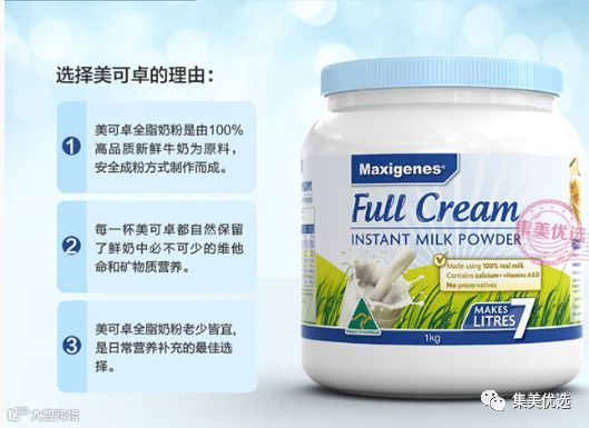澳洲maxigenes美可卓源于澳洲,澳洲奶制品的出口值为世界第一,美可卓成人全脂奶粉号称奶粉中的爱马仕,是由100%高品质新鲜牛奶味原料,俗称“蓝胖子”。完全成粉方式制作而成。每一杯美可卓都自然保留了鲜奶中必不可少的维他命和矿物质营养,老少皆宜,是日常营养补充的最佳选择。
