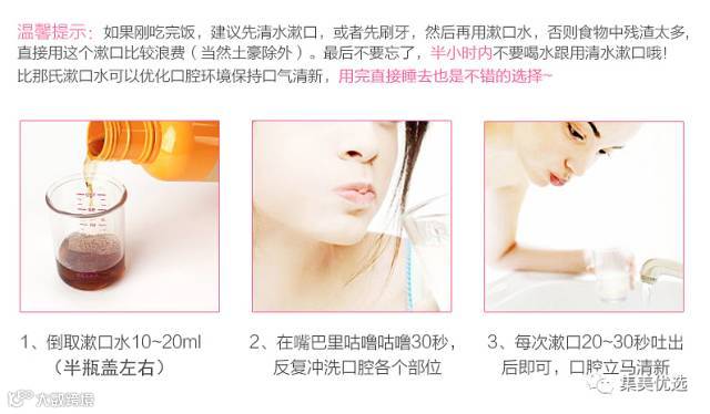 无需加水稀释可直接使用。取出适量10-15ml,漱口20-30秒后吐出,使用后请盖紧瓶盖后保管。