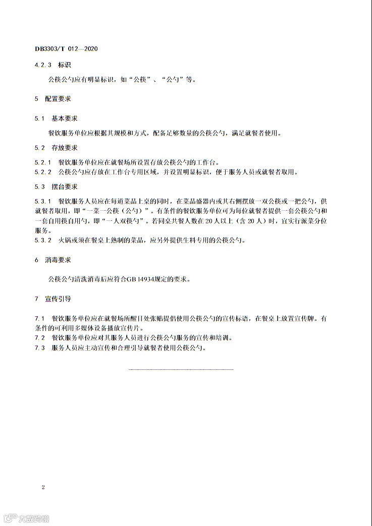 对于餐饮服务单位,本标准要求应根据其规模和方式,配备能够满足就餐者使用的足够数量的公筷公勺,存放在工作台的专用区域或专用抽屉中,并设置明显标识,便于服务人员或就餐者取用。此外,火锅或须在餐桌上熟制的菜品,应另外提供生料专用的公筷公勺。