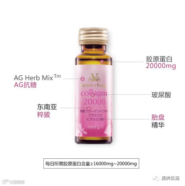 1.每瓶含有20000mg的小分子胶原蛋白,含量更高,更好吸收(目前市面上绝大部分胶原蛋白饮的单瓶含量仅为2500-5000毫克) 。