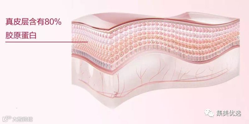 皮肤中胶原蛋白的含量占到72%,真皮中80%是胶原蛋白。