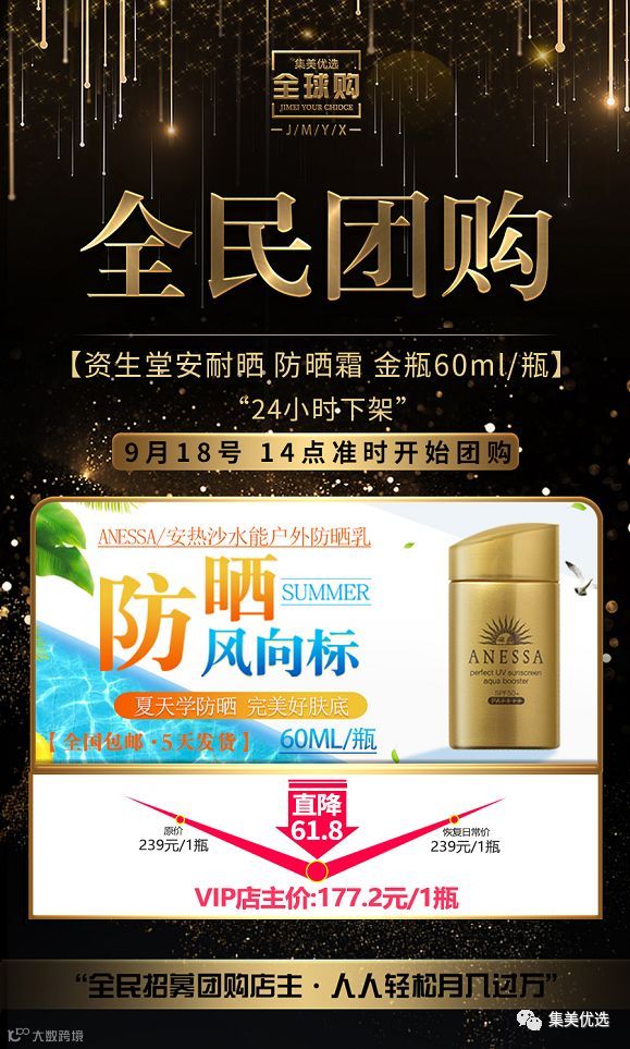 【福利团购】 资生堂 ANESSA 安热沙/安耐晒 防晒霜金瓶 防水防紫外线 60ml
