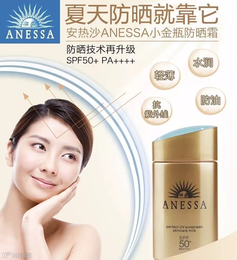 小金瓶防晒霜 大名鼎鼎的日本安耐防晒霜,全身涂不觉得浪费的日本安奈晒,想要晒不黑,那就靠他了!安奈晒官方的口号就是:绝对晒不黑!