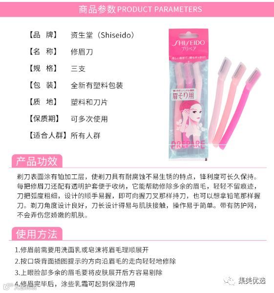 拔眉毛会让眼皮松弛,所以还是用刮的好,资生堂PREPARE眉刀使用起来非常顺手,手柄弧度刚好合握。由日本人间工学中心研制开发,对把柄长度、粗细及剃刀角度等都做出了精心设计,菜鸟级选手也可以得心使用哦,而且颜色又粉又嫩,真漂酿。