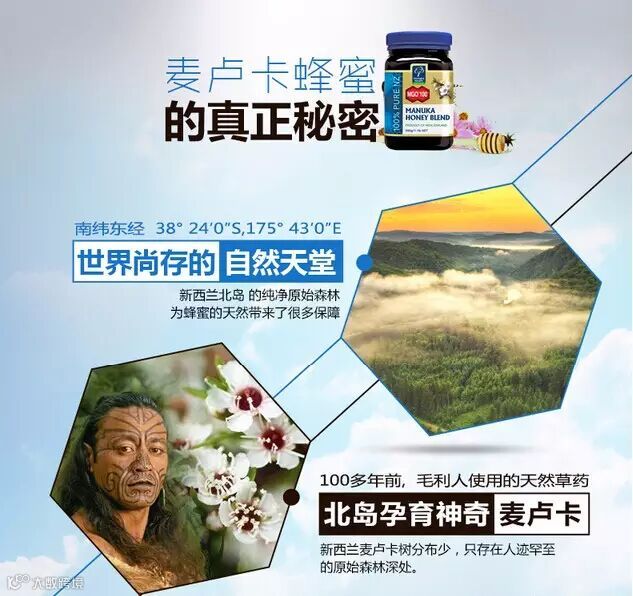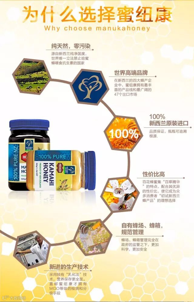 新西兰的麦卢卡蜂蜜,是新西兰独有的特色蜂蜜,为国宝级制蜜首选,浓醇蜜香,质滑芳甘,气蕴天成,风味迷人耐人寻味,且具有其它蜂蜜所没有的活性抗菌成分—麦卢卡因子UMF,它的特殊治疗能力甚至超过很多传统的药品,这使其优于其他蜂蜜,成为世界上最珍贵的蜂蜜之一,因此,麦卢卡蜂蜜也被称为“蜜中极品”。