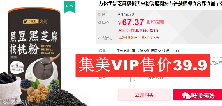 【大牌团购】万松堂 黑豆黑芝麻核桃粉500克/罐 原价:59元 VIP /黑卡M1会员 福利补贴价:39.9元 万松堂 黑豆黑芝麻核桃粉,由五谷杂粮和药食同源的天然草本植物搭配而成。 它沿袭传统手工研磨方式,采用低温烘焙技术锁住营养,将中国传统饮食补养文化与现代快节奏生活融为一体,最大程度地保留了食物原有的“食、香、味”及其营养价值。