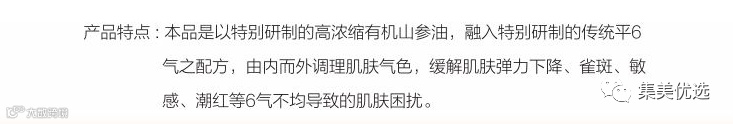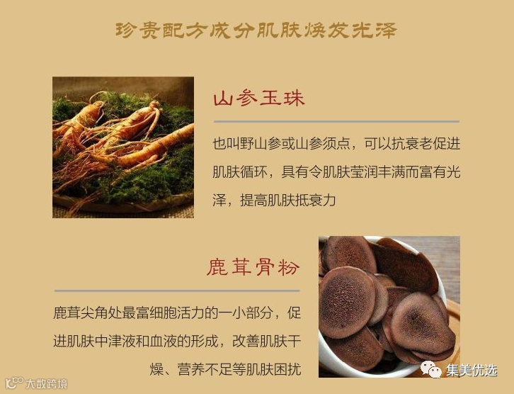它含有人参、鹿茸等多种珍贵的成分,滋润皮肤,调节微循环,亮肤活血抗衰老。