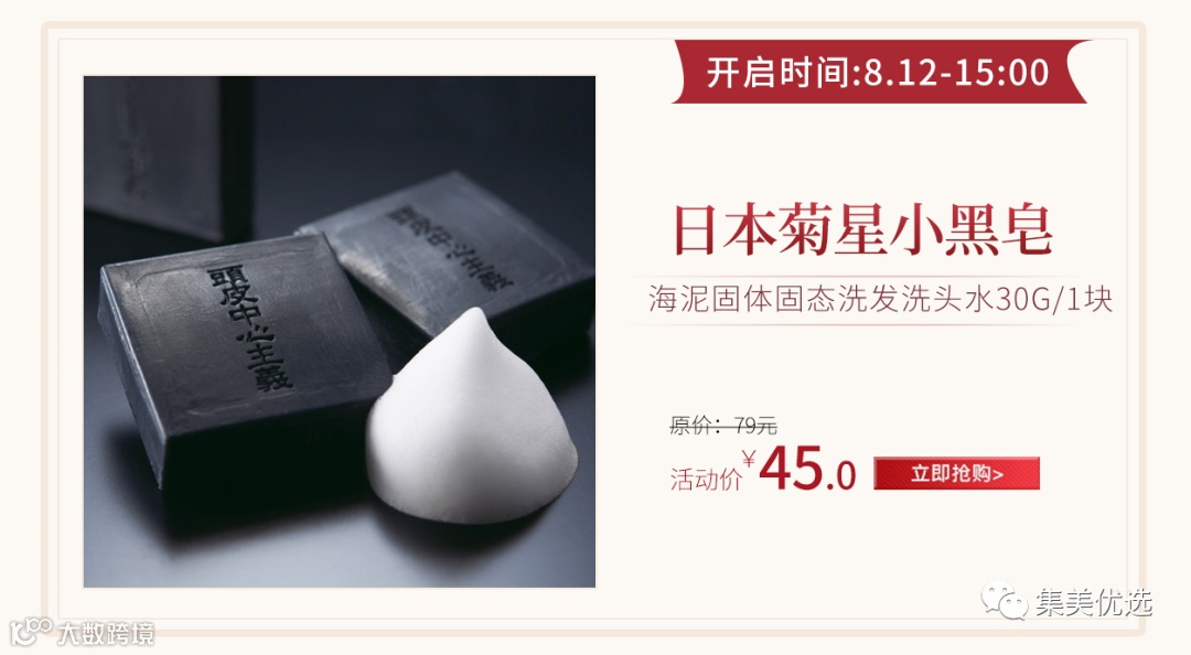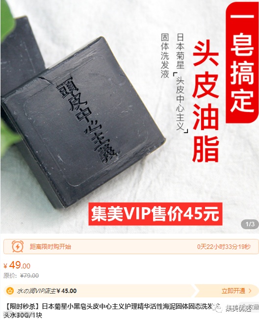 【限时秒杀】日本菊星小黑皂头皮中心主义护理精华活性海泥固体固态洗发洗头水30G/1块 原价:79元 VIP /黑卡M1会员 福利补贴价:45元 头发易掉、发丝干枯、头皮发痒...根本原因是,你的头皮不够健康。