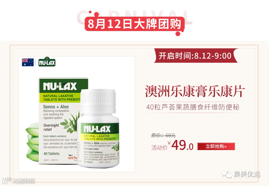 【大牌团购】澳洲NU-LAX乐康膏乐康片40粒芦荟果蔬膳食纤维防便秘清宿便排肠毒 原价:69元 VIP /黑卡M1会员 福利补贴价:49元 风靡澳洲号称“可以吃的化妆品”, 具有润肠通便效果