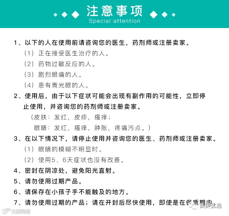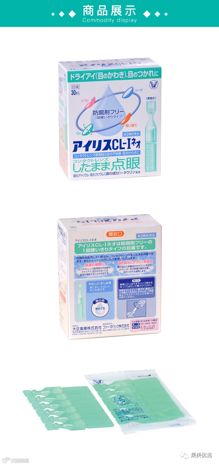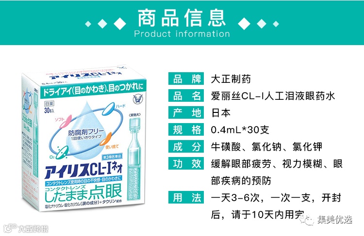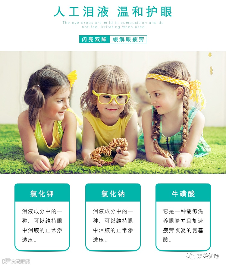 人工泪眼型眼药水,作为眼泪的成分的氯化钠和氯化钾,配合更加促进眼的新陈代谢的营养成分牛磺酸。给予眼部滋润和营养,改善眼部的不快症状