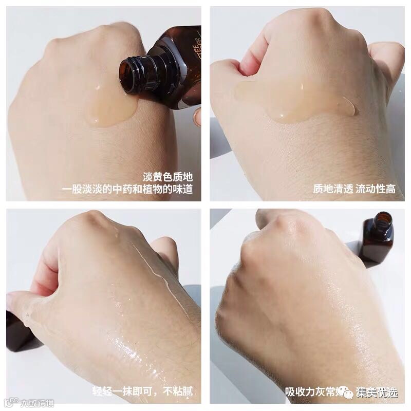 茶色半透明质地,上手第一感觉就像鸡蛋清一样的柔滑,流动性很好,滴在手背上,能很好的流动开。且闻着有淡淡的中药灵芝味,简直是老少通吃~很多小仙女都是自己和妈咪一人一瓶的备着的哦!