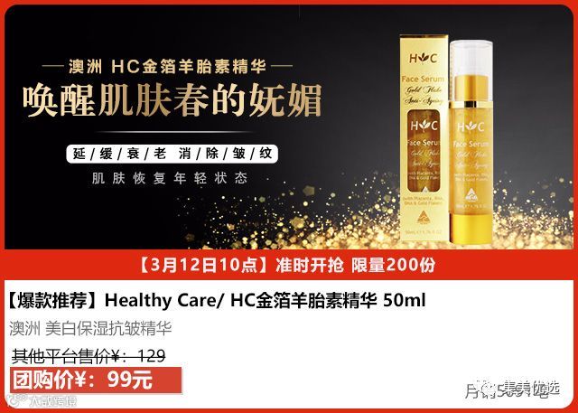 Healthy Care羊胎素金箔精华液,澳洲爆款!强烈推荐澳洲HC羊胎素美白保湿抗皱精华液 50ML,蕴含水溶性浓缩羊胎素、骨胶原蛋白、DHR RNA、维他命E、金箔、甘菊花。保湿抗氧化抗衰老,淡斑修复,美白滋养,像果冻一样,涂在皮肤上马上变成水样质地,超轻薄好吸收!味道太好闻了,十分滋养水润!