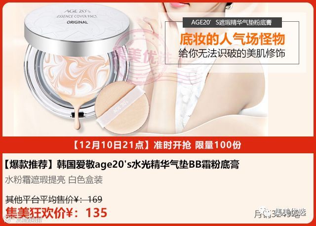 韩国AGE 20s精华粉饼霜,是目前韩国非常流行的底妆,10万余个好评堪称底妆界的"怪物"!这款精华粉底霜含有68%浓缩精华,拥有超强的遮瑕力,呈现自然裸妆效果,含有提亮因子,使用后提升整个人的气色,秒杀所有底妆的水粉霜,让肌肤一整天光滑洁净不泛油光专利遮瑕成分+专利油脂吸附成分,具备美白,改善皱纹,隔离紫外线三种功能,轻松打造精致裸装!