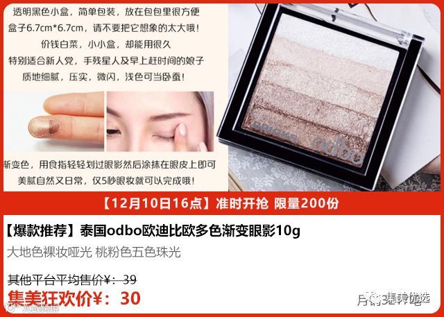 强烈推荐泰国爆款5色渐变眼影!价格很便宜,每个颜色都敲美! 带珠光,闪闪的仙气十足~渐变的颜色搭配很方便实用,可以单涂,也可以叠加混合。粉质细腻压的挺实,上色,用手指轻滑就能轻松画好眼妆。早上时间紧的话,用这款化眼妆那真的是又美又快!