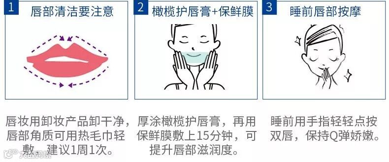 将唇部卸干净后,用热毛巾轻敷片刻,建议一周一次;厚涂唇膏,用保鲜膜敷上15分钟;轻轻按点双唇,摘下保鲜膜,就可以美美的睡觉啦~