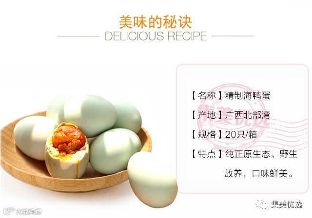 不是所有的咸鸭蛋,都是吃海鲜长大的,广西北部湾海鸭蛋,蛋黄橙黄起沙,口感绵软细腻,筷子轻轻一夹,能看到自然出油,味道鲜美无比。常吃鱼虾所产的海鸭蛋富含鱼虾中的铁、钾、碘、钙、磷、硒等多种对人体有益微量元素和维生素。它的蛋白质、氨基酸远高于普通鸭蛋。益于增强智力的卵磷脂更是比普通鸭蛋高得多。