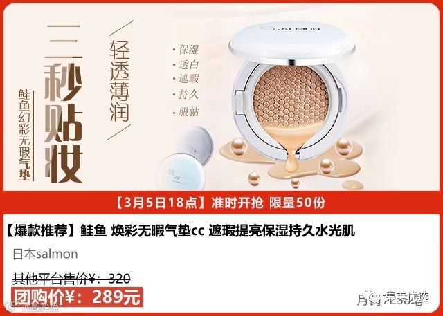 推荐一款特别好用的气垫——【日本人气新品】Salmon 鲑鱼幻彩无暇气垫。激光手术后也可以用的CC气垫,遮瑕、保湿、提亮秒杀市面其它产品。通过蜂窝妆上百万个微气孔充气作用,使精华底妆更保湿、更持久、更服帖!