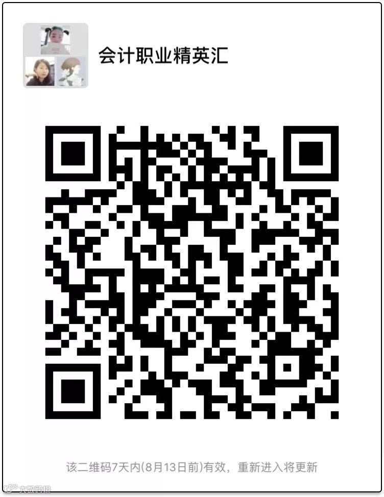 我想了很多办法如何帮助小伙伴们解决你们的小疑惑,所以‘会计职业精英汇’小社群就在这么简单的初心下成立了,你的高质量社交圈由你自己决定,你的高质量会计学习圈,我们来一路陪同,欢迎志同道合的小伙伴加入我们的小社群,不定期分享中小企业财务知识、政策解析,也可帮你解决职场小困惑。(二维码过期后,小伙伴们如果想入群可以留言“加群”,我会补发二维码给你的哦~)