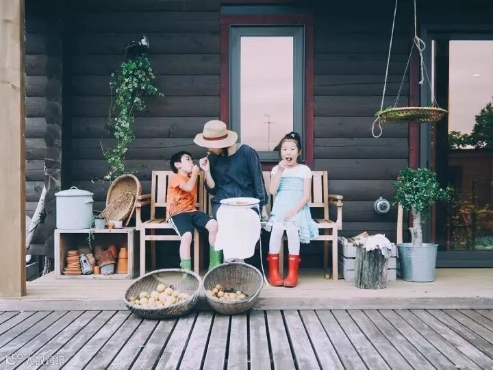 一家人坐在门槛上赏秋,