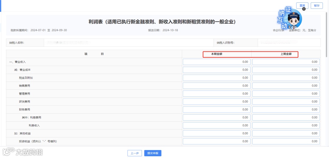 ※按季申报:“本期金额”填报纳税人所属年度1月1日至所属季度最后一日的累计数。“上期金额”填报纳税人上年1月1日至上年同期季度最后一日的累计数。