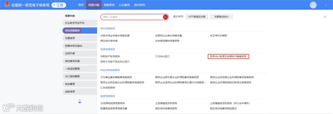答:登录新电子税局,依次点击【我要办税】-【综合信息报告】-【财务会计制度及核算软件备案报告】进入模块。