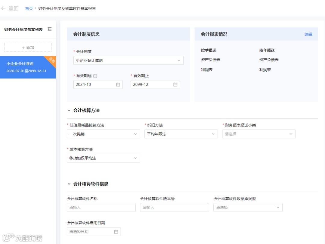 系统将自动带出当前正在使用的财务会计制度备案信息,请点击“会计报表情况”卡片右上角的【编辑】,核对信息是否正确,若不对,请对会计报表报送情况进行修改。修改成功后,回到【财务会计制度及核算软件报告】页面,点击【提交】。