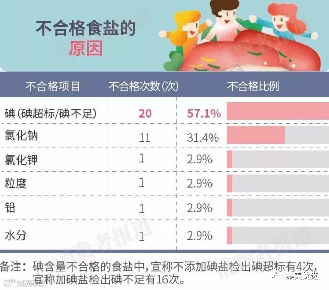 然而,近5年以来,国家及省级市场监管局共检出33批次不合格食用盐,当中包括海盐、湖盐、岩盐、井盐等多个食用盐品种,不合格原因为碘含量、氯化钠、氯化钾、粒度、铅、水分,其中碘含量不符合国标高达20次,占不合格比例的57.1%。