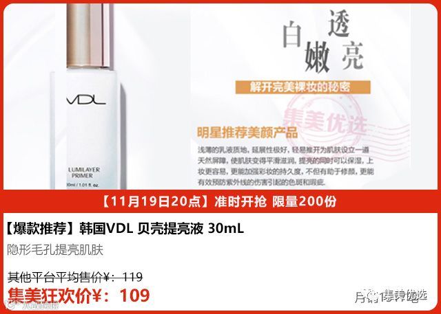 VDL贝壳提亮液30ml,隐形毛孔、遮瑕、保湿、提亮、一步到位,韩剧女主角拍戏必备 贝壳提取成分,增加肌肤丰富感,打造3D立体妆容!上妆后有隐隐的闪光感,满满的水份感,立刻呈现光泽饱满肌肤!清爽不油腻,妆前乳还可以和BB霜混合使用,提亮效果立现。