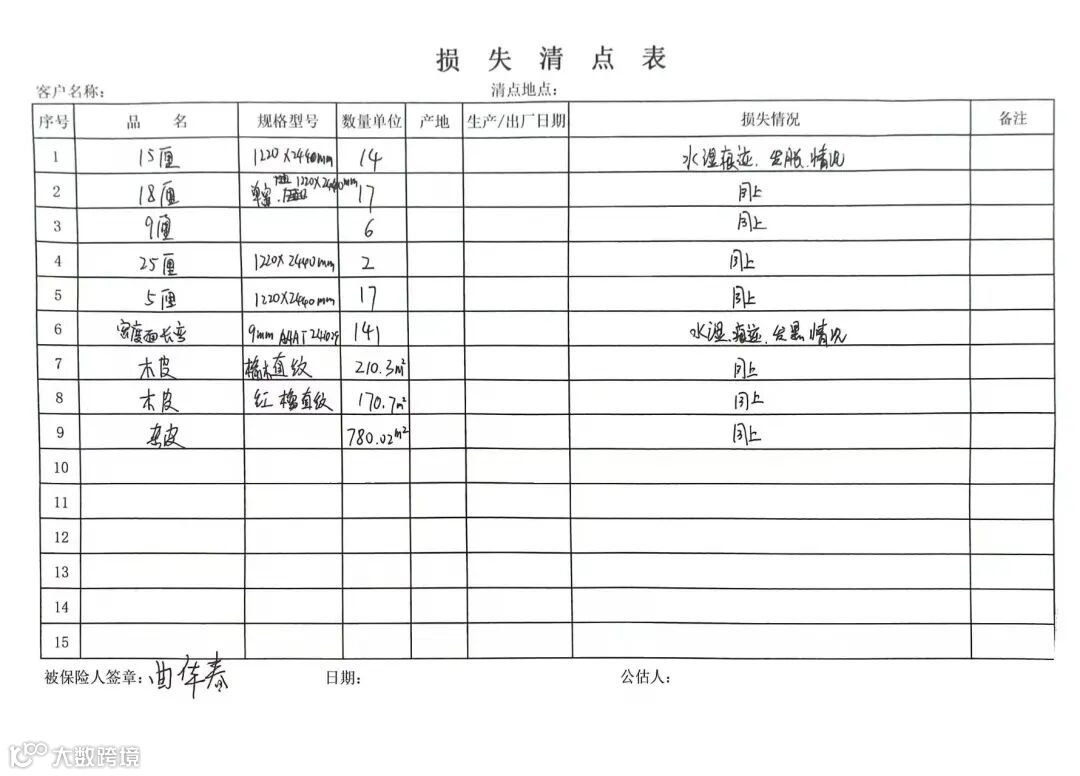 受损原因: 雨淋水湿