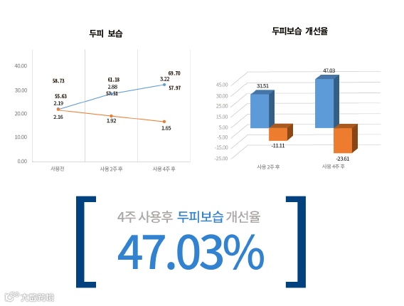 第二组测试是对“头皮保湿”效果进行的测试。同样是测试者进行为期4周的产品使用,使用BATH1000的4周后,头皮保湿的改善率达到了47%。