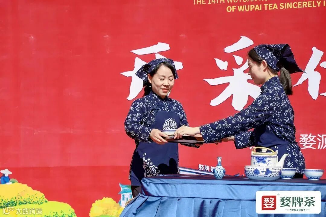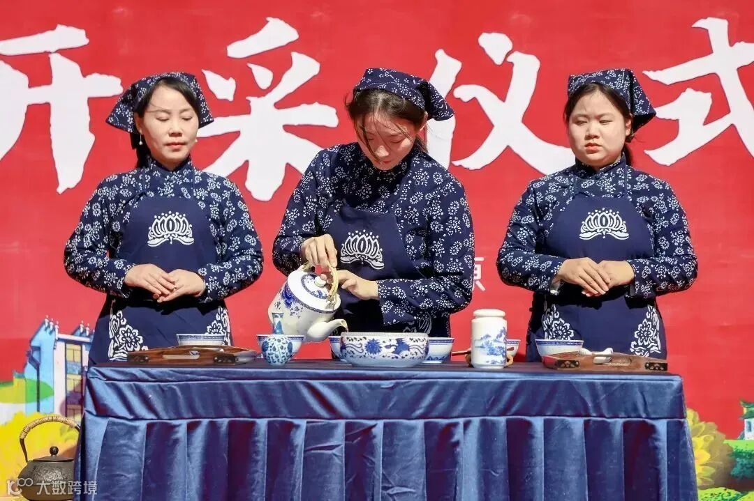 茶道姑娘头系蜡染头巾,身穿青花小褂,外围绣花围裙,简朴大方,明快素雅,散发出来浓郁的乡村气息。农家茶的茶具是一种青花小碗,婺源叫汤瓯(ou),在乡村一般用来饮茶,既简朴又方便;投茶之前,先用热水将瓷壶和汤瓯荡洗一遍,泡茶使用“壶泡法”,就是将茶泡在壶里,然后再分饮;