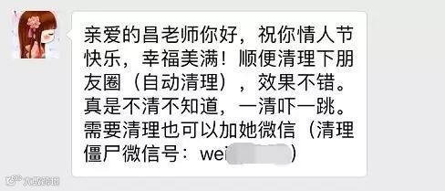“亲爱的xxx你好,祝你情人节快乐,幸福美满!顺便清理下朋友圈(自动清理),效果不错。真是不清不知道,一清吓一跳。需要清理也可以加她微信(清理僵尸微信号: ****)”