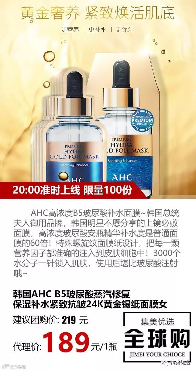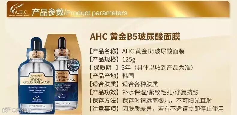 韩国AHC B5玻尿酸蒸汽24K黄金锡纸面膜女