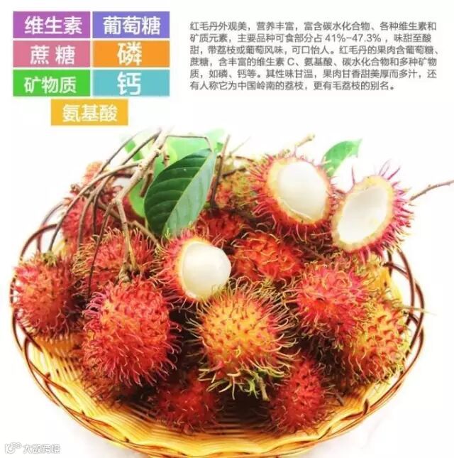 红毛丹,又名毛荔枝,韶子,红毛果,红毛胆。成熟的红毛丹果并非都是红色的,还有黄色的果子。泰国红毛丹有“果王”之称。