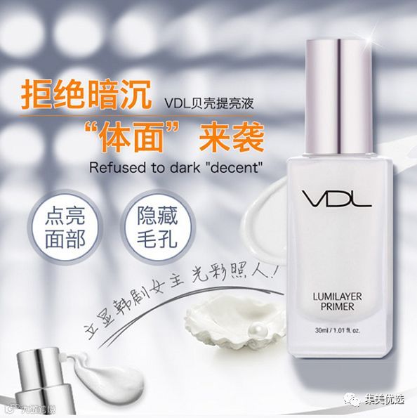 这个可以说是和粉底的绝妙搭配。大家看韩剧,经常觉得韩剧女猪脚的皮肤好有光泽,粉嫩透亮,那么秘密就在这种提亮液上了。作为妆前乳使用,配合粉底,肤色立刻提亮,但是又不会是那种特别夸张的闪光,是那种很内敛、很自然的闪,显得肤色很好。提亮液同粉底液1:1混合使用,而且这个质地很清爽,不油,不必担心和粉底一起会油腻,会厚重和有负担。非常清透!而且这个还有一个很大的特点就是非常的保湿!一点都不会干,所以干皮肤,那种涂了粉底显得没有光泽的童鞋,这个用起来也会很湿润。VDL最为妆前乳,那最基本的隐形毛孔的功效还是有的,所以这个总结起来:既可以隐形毛孔、保湿,又可以提亮肤色,是多位一体啊!