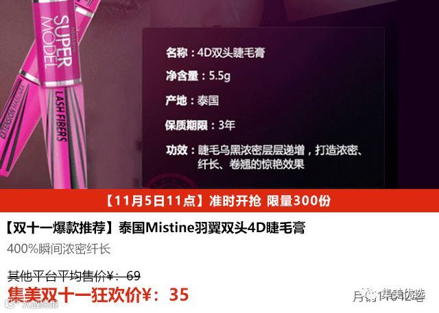 美妆教主朴信惠推荐泰国Mistine羽翼双头4D睫毛膏,创新的薄膜技术,使膏体均匀不结块,使用时完全不会有刷出苍蝇腿的麻烦。独特的双头设计,瞬间浓密400%,睫毛乌黑浓密层层递增,一支就能打造浓密、纤长、卷翘的惊艳效果,短小细睫也能绽放深邃娇俏的猫眼魅力。限量300份,集美直批价只需35!