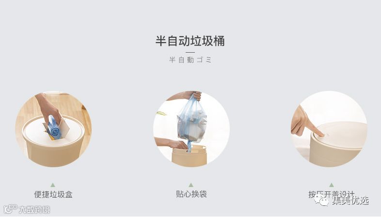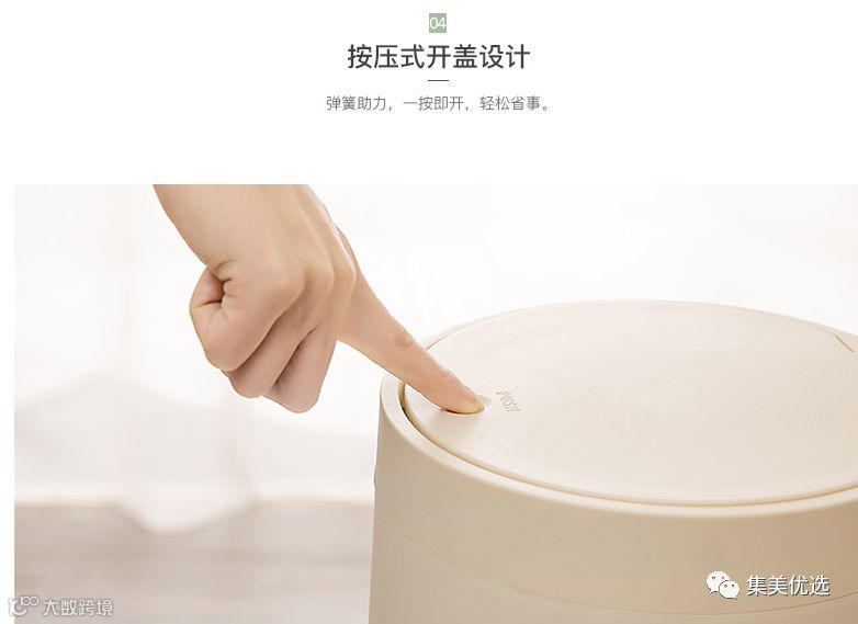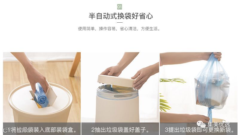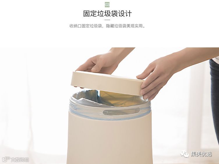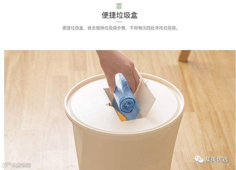便携装袋设计,轻松换袋功能,桶盖可拆除,一键开启设计。桶盖可拆卸,清洗更方便