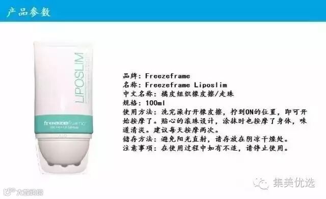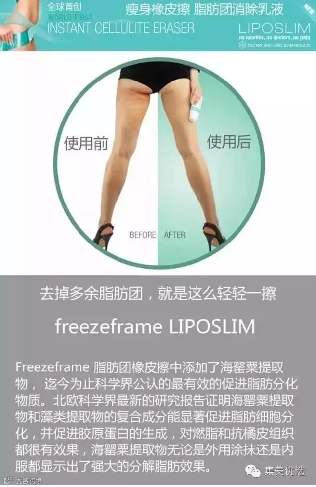消脂,紧致,减肥,光滑皮肤一步到位。 Freezeframe Liposlim的去脂精致皮肤霜不油腻,很好吸收,而且没有其他产品的奇怪的香味希望皮肤光滑紧致。快下手吧。