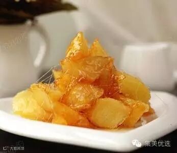 6、倒入炸好的苹果块迅速翻匀,起锅盛到抹过油的盘子里即可。