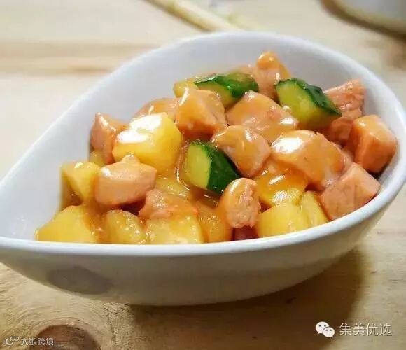 鸡胸肉、苹果、黄瓜、食油、生抽、淀粉、番茄沙司、洋葱