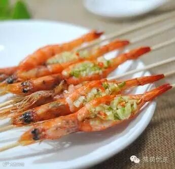 2、将腌好的河虾串在竹签上(没有竹签也可以不穿直接铺在垫了锡纸的烤盘上)。
