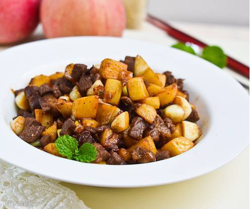 6、将牛肉粒回锅翻炒后,倒入苹果粒。