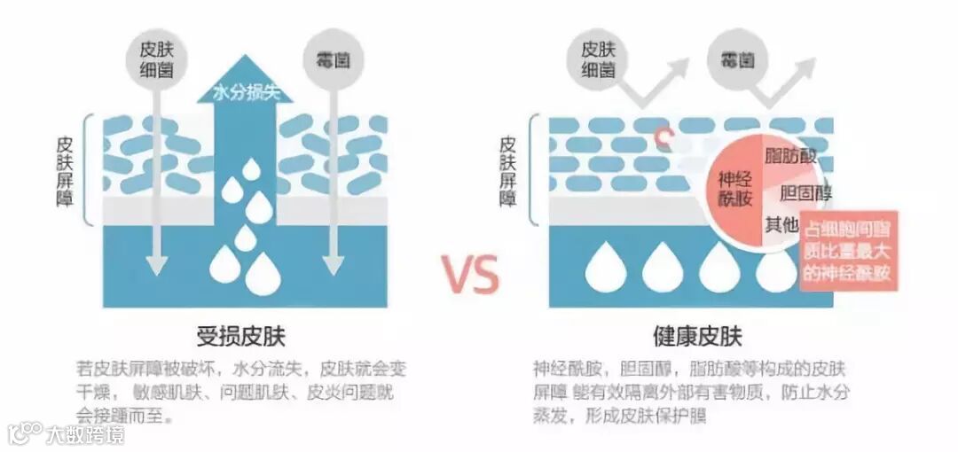 皮肤本身是由一层层细胞并列组成的,并非毫无间隙,当皮肤缺水屏障就会受损,细胞缩小,细胞间脂质流失,会形成间隙变大,变成肉眼看不见的小伤口。