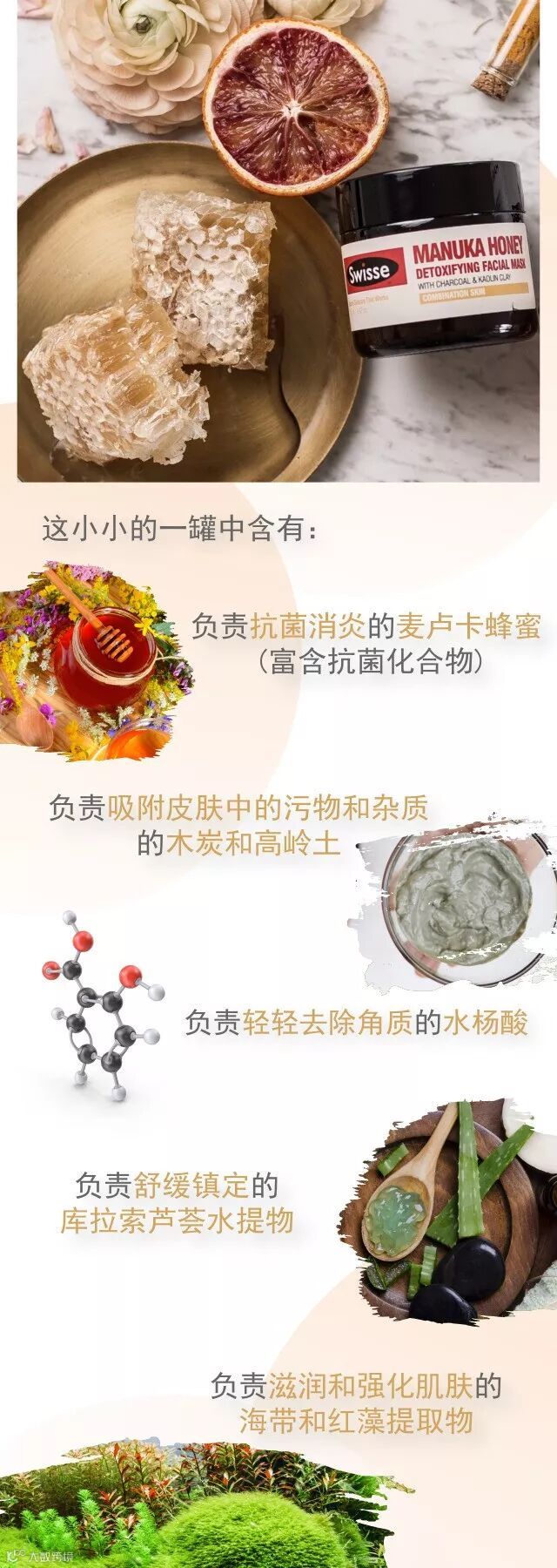 含有矿物质,天然排毒,强效吸附污垢,深层清洁皮肤。