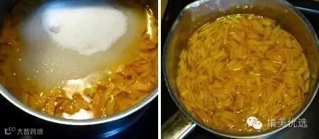 3、转小火煨45分钟到1小时,直至橙皮变成下图左边呈现的半透明状。