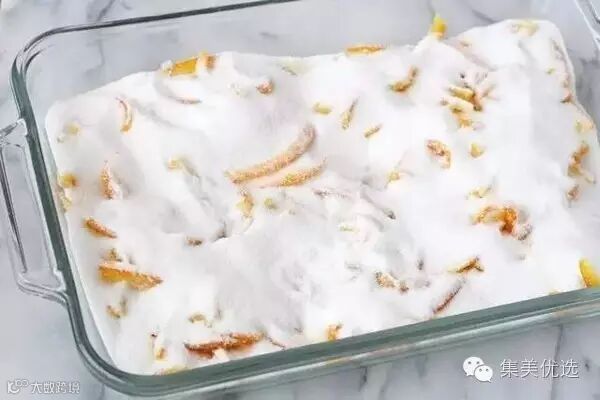 4、把橙皮从锅内捞起沥干,倒入盘内,加入3杯糖,均匀覆盖所有橙皮。